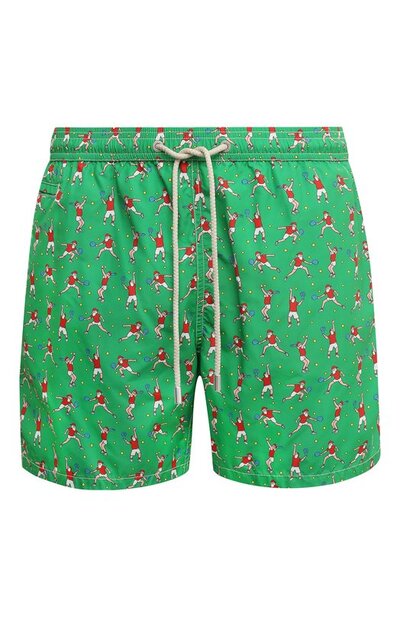 Для пошива зеленых плавок-шортов использовали тонкий материал с паттерном в виде Санта-Клауса, играющего в теннис. Прочный легкий текстиль быстро сохнет и не требует особого ухода. Посадку на талии можно регулировать шнуром, продетым в эластичный пояс-кулиску.