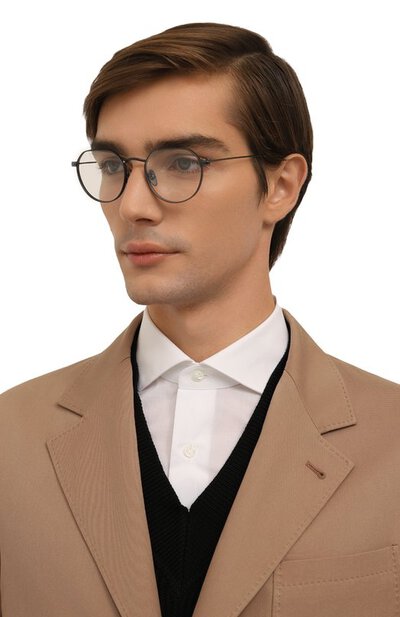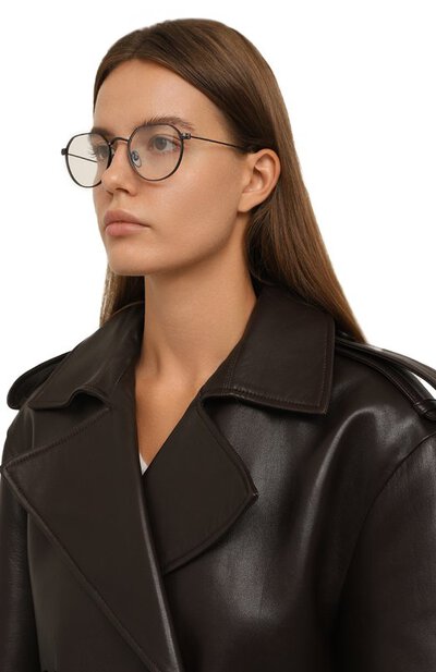 Тонкая серая оправа с небольшими круглыми рамками подойдет и женщинам, и мужчинам. Аксессуар выполнили вручную из прочной и при этом легкой нержавеющей стали. Чтобы дужки не вызывали неприятные ощущения на коже в холодную погоду, их дополнили прозрачными заушниками из теплого на ощупь ацетата.