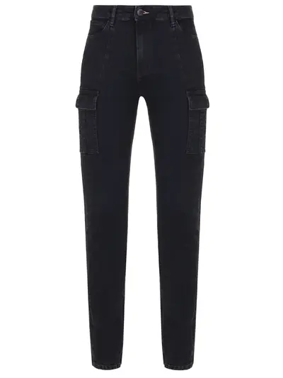 -Черные узкие джинсы-карго из смесового хлопка от 3Х1. -Модель облегающего кроя со средней посадкой, поясом со шлевками, прорезными и накладными карманами, застежкой на молнию и пуговицу.