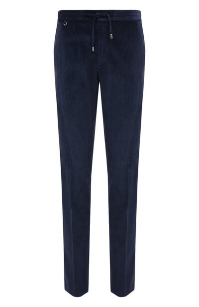 Темно-синие брюки с широким поясом-кулиской и четырьмя врезными карманами сшиты из фактурного хлопкового вельвета. Нити модала в составе делают материал мягче, а изделия из него отлично пропускают воздух и почти не мнутся. Одна из шлевок украшена металлическим восьмиугольником, знаковым для марки.