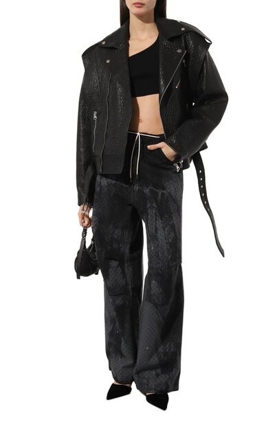 Черные джинсы запросто станут главным акцентом в образе. Все благодаря неравномерному окрашиванию и сверкающим кристаллам, которые разместили по всей поверхности изделия. Для пошива свободной модели с защипами в области колен, складками сзади и регулируемым поясом-кулиской использовали мягкий деним. Посадка на талии регулируется контрастным шнуром.