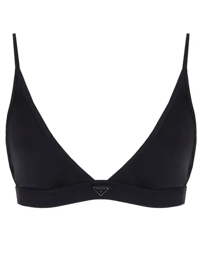-Модель с треугольными чашками, эластичным поясом под грудью с треугольным логотипом, узкими регулируемыми бретелями, застежкой на крючки сзади.