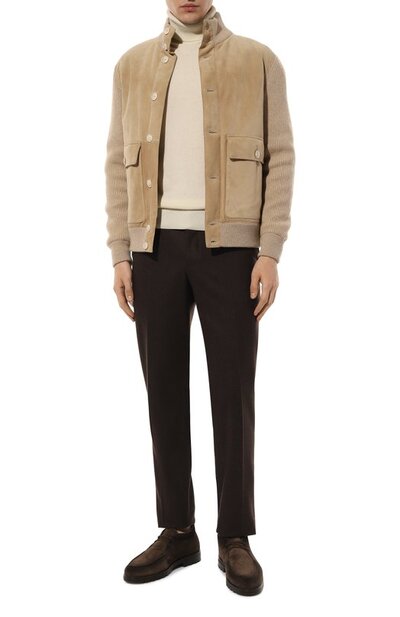 Скромный бежевый оттенок не мешает кардигану быть максимально выразительным и элегантным. Все дело в сочетании материалов разной фактуры и итальянского качества. Рифленые спинку и рукава модели связали из тончайшего кашемира, а перед выполнили из нежной бархатистой замши искусной ручной выделки. Комфортным решением для холодной погоды изделие с высоким воротом делает слой почти невесомого утеплителя Thermore.