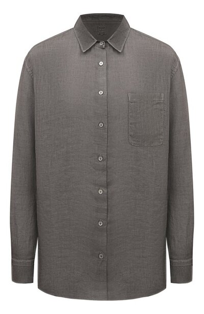 Свободную рубашку из тонкого, чуть просвечивающего льна окрасили в серый цвет в готовом виде. Неровные нити ткани по-разному впитали пигмент, поэтому оттенок кажется меланжевым, а каждый шов очерчивают светлые полосы, создающие иллюзию того, что с моделью не расставались несколько лет.
