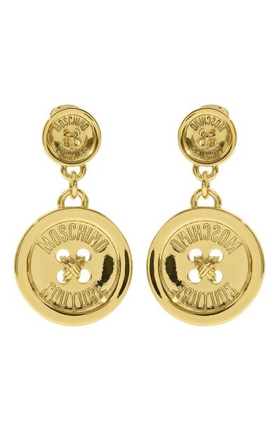 Клипсы в виде брендированных пуговиц с четырьмя отверстиями, дополненные такими же, но более крупными подвесками, добавит образу долю иронии. Для изготовления аксессуара использовали легкие прочные замак и латунь с гальваническим покрытием золотом, поэтому он не оттянет мочку.