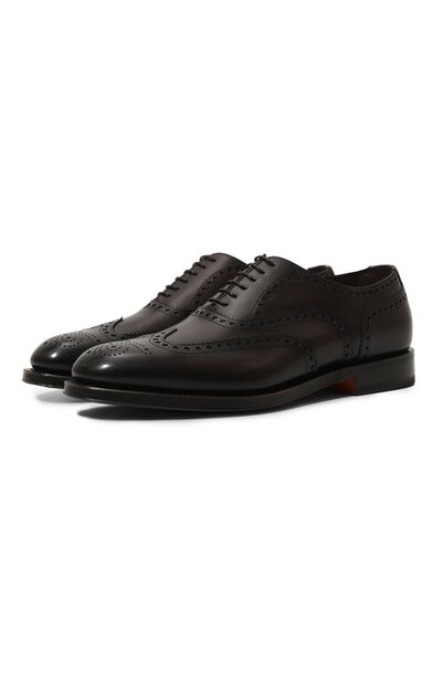 Оксфорды из тонко выделанной гладкой кожи делает менее строгими перфорированный узор, как у брогов. Чтобы фактурный рисунок стал более заметным, темно-коричневую пару с миндалевидным мысом тщательно отполировали. Верх соединили с подошвой по методу Goodyear, поэтому туфли получились очень прочными.