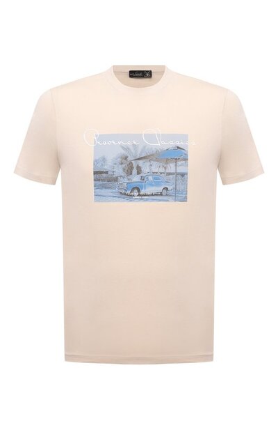 Светло-бежевую футболку с круглым вырезом сшили из мягкого хлопкового джерси, которое позволяет коже дышать и не стесняет движения. Спереди изделие декорировали принтом в синих оттенках, напоминающим открытку. Рисунок не лишает модель способности сочетаться с одеждой разных цветов.