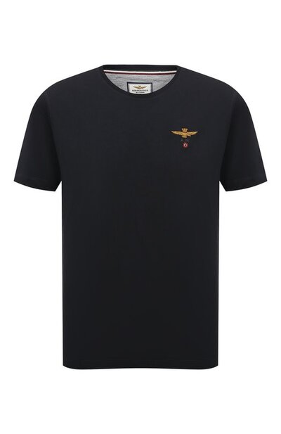 Темно-синюю футболку с короткими рукавами сшили из в плотного джерси, которое хорошо пропускает воздух и тянется, не мешая движениям. Единственным декором модели стала эмблема марки в виде коронованного орла, вышитая спереди. Изделие составит идеальный тандем с потертыми джинсами, а завершить образ предлагаем кедами.