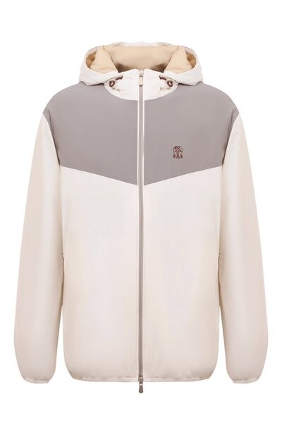 Куртку из линии одежды Travelwear выполнили из почти невесомого технологичного нейлона, который не мешает циркуляции воздуха. Стрейчевые нити делают ткань эластичной, внутренняя мембрана защищает от дождя, а наполнитель Thermore совмещает в себе легкость и тепло. Плечи изделия подчеркнули широкой серой вставкой, а слева от встречной молнии вышили эмблему марки, основанной Брунелло Кучинелли.