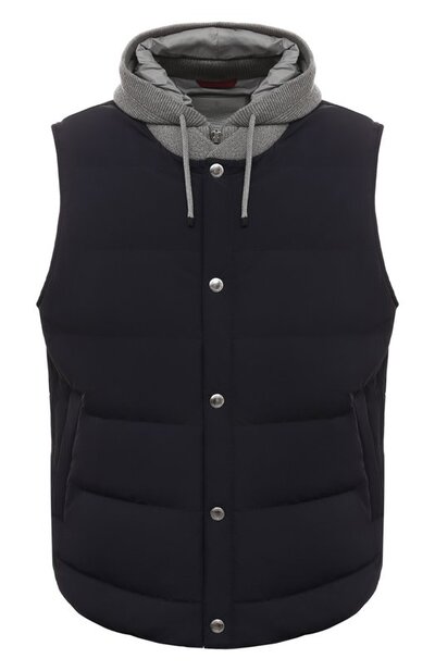 Темно-синий стеганый жилет выручит в капризное межсезонье: его можно носить как верхнюю одежду или превратить в дополнительный слой под тонким пальто. Для пошива модели использовали эластичный мембранный нейлон, обработанный водоотталкивающим составом. Еще комфортнее изделие делает легкий наполнитель из отборного гусиного пуха и съемная нагрудная вставка с регулируемым капюшоном, выполненная из мягкого трикотажа.