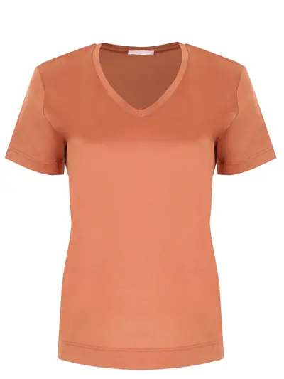 -Оранжевая футболка из мягкого хлопка от CIRCOLO 1901. -Модель полуприлегающего кроя с короткими рукавами и V-образным вырезом горловины станет базой как для спортивных образов, так и для повседневных аутфитов с джинсами, шортами или брюками.