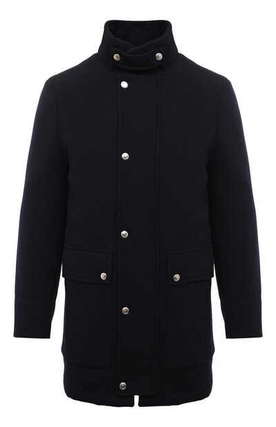 Прямое темно-синее пальто мастера марки, основанной Брунелло Кучинелли, сшили из премиальной шерсти с добавлением нежного кашемира. Изделие из такой легкой пластичной ткани отлично удерживает тепло и комфортно садится по фигуре, а воротник-стойка и штормовая планка, закрывающая молнию, защищают от ветра. Модель с блестящими кнопками дополнили большими накладными карманами с клапанами.