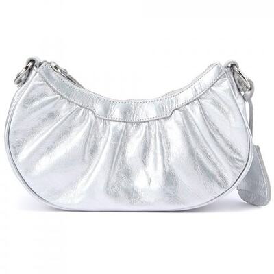 Серебристая сумочка из натуральной кожи от Lancaster. Эта небольшая сумка в форме полумесяца изготовлена из мягкой яловой кожи. Благодаря длинному ремню её можно носить на плече или через плечо. Сумка закрывается на молнию, внутри вместительное отделение и дополнительный карман на молнии. В комплекте небольшой кожаный брелок с логотипом бренда.