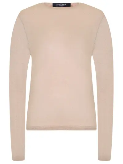 -Золотисто-бежевый полупрозрачный джемпер из тонкого вискозного трикотажа, расшитого люрексной нитью, от FREE AGE. -Модель полуприлегающего силуэта с длинными рукавами и круглым вырезом горловины дополнит повседневные образы с брюками или джинсами.