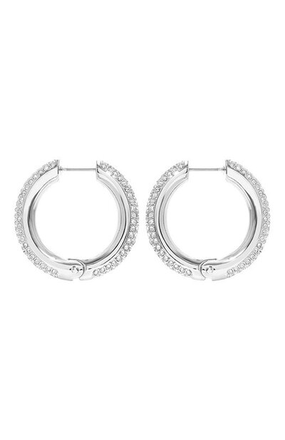 Широкие серьги-кольца гармонично впишутся и в повседневный, и в коктейльный образ. Для изготовления аксессуара использовали легкий ювелирный сплав с родиевым покрытием. Изделие инкрустировали сверкающими кристаллами, которые эффектно переливаются в лучах света.
