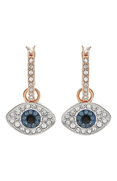 Серьги с подвесками в виде глаза напоминают талисман. Для изготовления украшения из коллекции Symbol использовали ювелирный сплав с покрытием оттенка розового золота. Модель инкрустировали миниатюрными кристаллами, которые ловят каждый луч света.