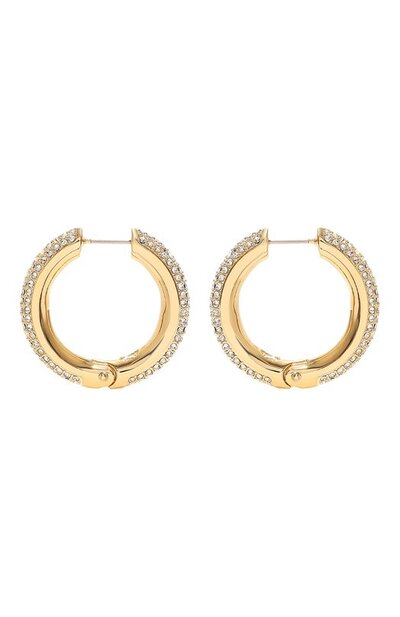 Эти серьги-кольца среднего размера из коллекции Dextera выполнили из ювелирного сплава и дополнили паве из полупрозрачных кристаллов, которым инкрустировали всю поверхность. Аксессуар органично будет смотреться и с коктейльным платьем, и с простыми футболкой и джинсами.