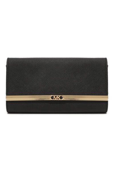 Небольшой черный клатч Mona сшили из прочной сафьяновой кожи, которая не боится царапин и не деформируется от влаги. Широкий клапан декорировали рифленой золотистой накладкой с монограммой из инициалов Майкла Корса. Если пристегнуть ажурный ремень-цепочку, модель можно носить кросс-боди или на плече. В основное отделение поместятся смартфон, ключи и картхолдер.