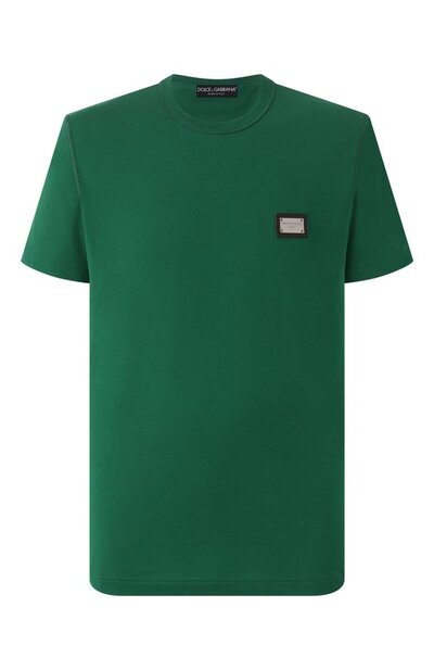 Для пошива футболки насыщенного изумрудного цвета использовали мягкое джерси из отборного хлопка. Его волокна тоньше, прочнее и эластичнее обычного, а в гладкости не уступают шелку, поэтому изделие комфортно садится по фигуре и долго не теряет безупречный вид. Принадлежность модели бренду Доменико Дольче и Стефано Габбана деликатно обозначили фирменной металлической пластиной с выгравированным логотипом.