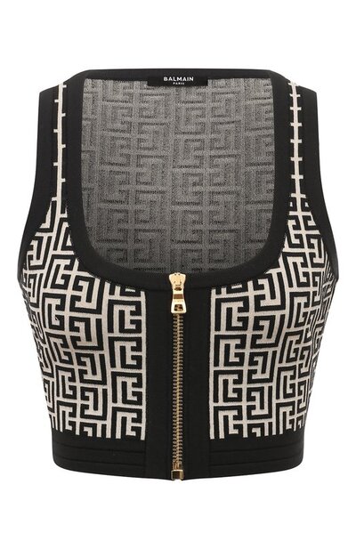 Облегающий крой этого топа с широкими бретелями позаимствовали у базовой майки и обыграли по-новому, сделав укороченным и дополнив акцентной молнией спереди. Тонкое джерси заменили более плотным и вместе с тем очень мягким трикотажем из отборной шерсти и вискозы, который приятно ощущается на теле. На белом материале вывязали черную повторяющуюся монограмму из инициалов Пьера Бальмана, а края обрамили однотонными графичными кантами.