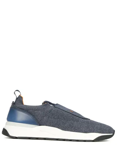 -Синие кроссовки из плотного трикотажа с отделкой натуральной кожей от SANTONI. -Модель с прорезиненным мысом, функциональной шнуровкой, кожаным задником с логотипированной петлей, толстой резиновой подошвой с глубоким протектором, внутренней отделкой из натуральной кожи.