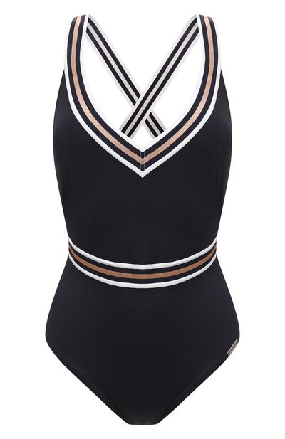 Для создания темно-синего слитного купальника выбрали приятную на ощупь микрофибру, которая быстро сохнет и не деформируется под воздействием соленой и хлорированной воды. Талию и V-образный вырез подчеркнули трехцветной лентой, мерцающей золотистым люрексом. Из нее же выполнили бретели, перекрещивающиеся на открытой спине.
