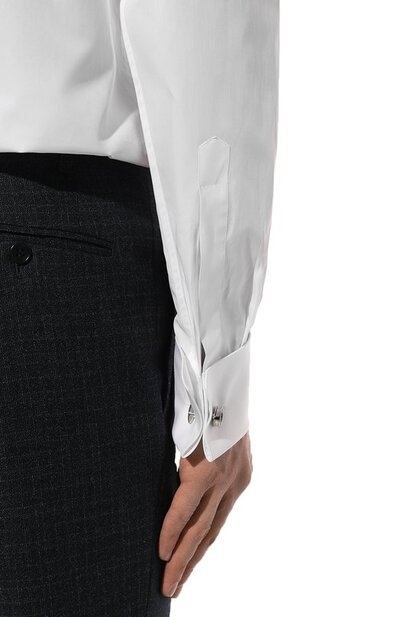 Белоснежную сорочку с потайной застежкой, скрытой под широкой планкой в тон, мастера марки, основанной Стефано Риччи, выполнили из легкого тонкого хлопка, напоминающего на ощупь нежный шелк. Изделие из такой ткани премиального качества хорошо пропускает воздух и долго сохраняет идеальный внешний вид.