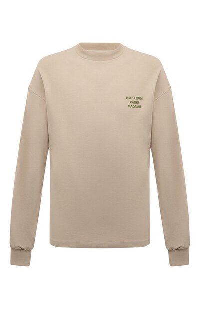Для пошива бежевого лонгслива со спущенной линией плеч использовали мягкий хлопковый интерлок с одинаково гладкой фактурой снаружи и внутри. Модель свободного кроя украсили сзади крупным зеленым слоганом Not from Paris Madame и повторили миниатюрную версию фирменной надписи спереди.