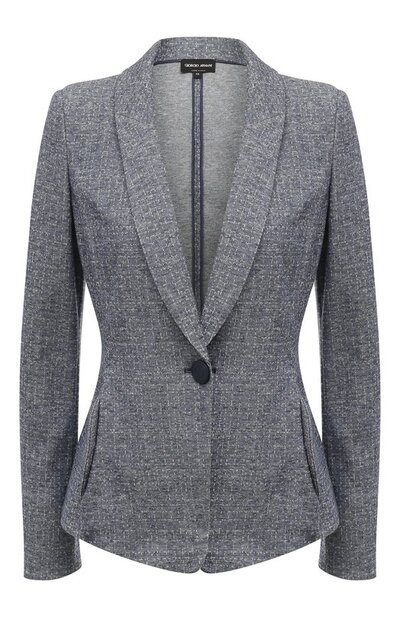 Строгий приталенный силуэт у синего жакета с узкими лацканами Джорджо Армани смягчил, выбрав для пошива не плотную костюмную ткань, а приятный на ощупь материал на основе хлопка. Чтобы меланжевая модель без подклада лучше держала форму и не растягивалась со временем, в состав добавили прочные волокна полиэстера.