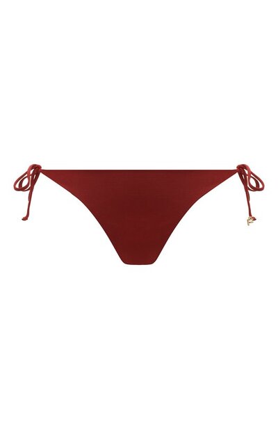 Плавки-бикини с брендированной нашивкой сзади сшили из эластичной нейлоновой микрофибры. Посадка модели регулируется завязками по бокам, одну из которых украсили подвеской в виде литеры F.
