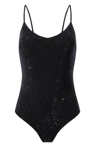 Слитный купальник из эластичной микрофибры полностью покрыли кристаллами в тон спереди. Принадлежность модели с узкими бретелями марке обозначили нашивкой с контрастным логотипом сзади.