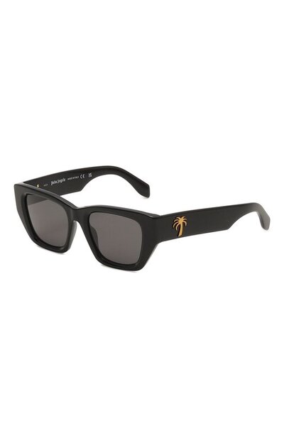 Черные солнцезащитные очки с темными плоскими линзами полностью блокируют вредный для зрения ультрафиолет, снижают нагрузку на глаза и отражают яркие блики. Легкая оправа изготовлена из глянцевого прочного ацетата, отполированного до безупречной гладкости. Широкие дужки украшены золотистыми аппликациями-пальмами, знаковыми для бренда.