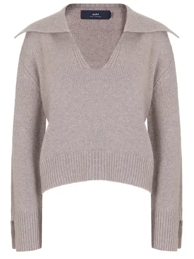 -Серый вязаный джемпер-оверсайз из мягкого кашемира от ARCH4. -Стилизованная под поло модель дополнена спущенной линией плеча, длинными рукавами, отложным воротником, V-образным вырезом на груди, рельефным манжетами и поясом.