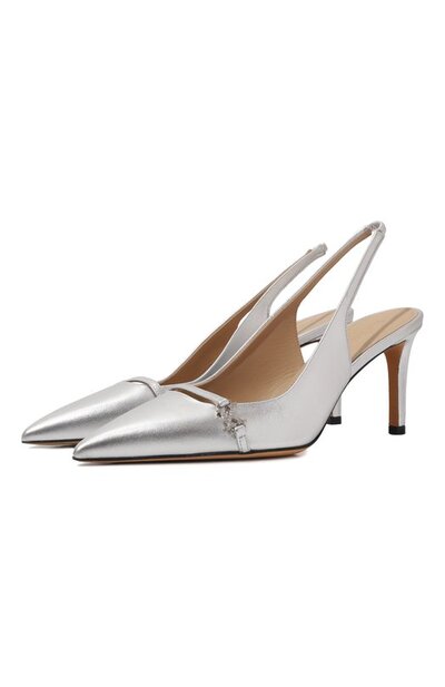 Серебристые туфли с зауженным мысом выполнили из мелкозернистой металлизированной кожи, которую обработали по технологии тонкой выделки. Союзку подчеркнули узкой перемычкой с деталью в виде литеры K, украшенной паве из стразов. Открытый задник дополнили ремешком с эластичной вставкой, отвечающей за удобную посадку по ноге.