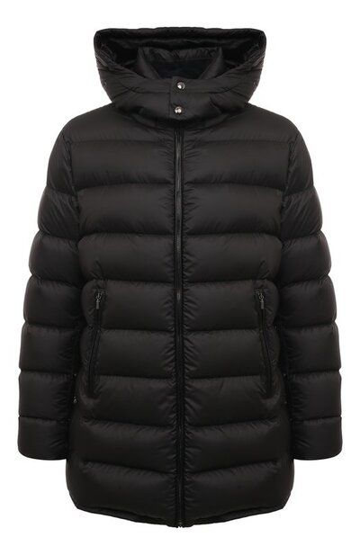 Стеганую куртку с глубоким съемным капюшоном сшили из прочного непромокаемого нейлона с водоотталкивающим покрытием. Максимально комфортной модель делает наполнитель из отборного гусиного пуха и укороченная манишка, создающая эффект многослойности и дополнительно защищающая от ветра. Пуховик, внутренние и внешние карманы застегиваются молниями, усиленными кантами из тонкой кожи.