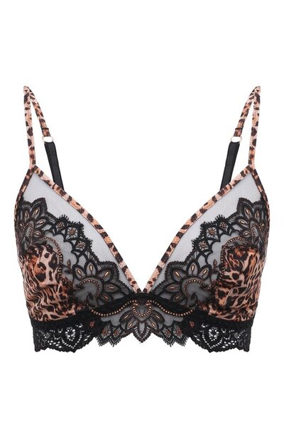 На мягких треугольных чашечках этого бюстгальтера без косточек чередуются гладкий текстиль с леопардовым принтом и тонкий черный тюль с вышитым растительным орнаментом. Вставка из прозрачного узорного текстиля дополняет и эластичный пояс из нежного кружева, который застегивается двумя крючками сзади, а золотистые бусины украшают узкие регулируемые бретели.