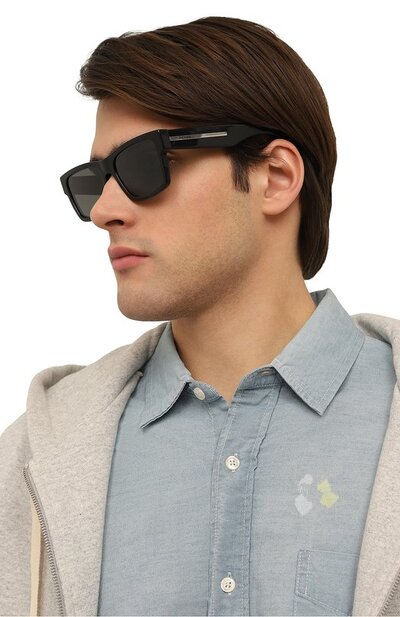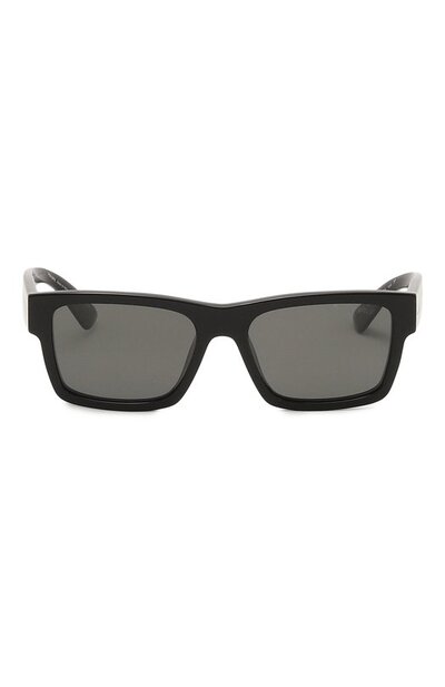 Черную оправу больших квадратных очков выполнили из легкого прочного ацетата, отполированного до глянцевого блеска. Широкие фигурные дужки декорировали темно-серебристой пластиной с выгравированным логотипом. Однотонные антрацитово-серые линзы из устойчивого к потертостям поликарбоната обеспечивают 100% защиты от ультрафиолетовых лучей.