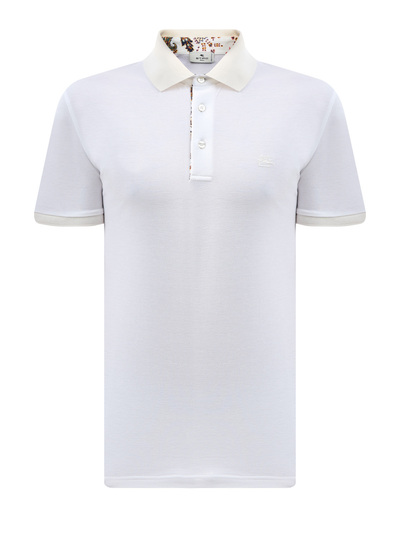 Мужское поло в стиле leisure от Etro выполнено из хлопка пике в белом цвете. Полностью натуральный состав делает модель универсальным элементом базового летнего гардероба. Потайной принт под классическим отложным воротом вносит в образ неформальный акцент. Детали: застежка на пуговицы, вышитый логотип бренда в тон. Сделано в Италии.