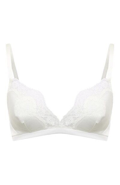 Широкие вставки из сицилийского хлопкового кружева с цветочным узором украшают V-образный вырез этого белого бюстгальтера. Полупрозрачному декору в нежности не уступает эластичный шелковый сатин, из которого выкроили мягкие треугольные чашечки без косточек и пояс. Модель с узкими регулируемыми бретелями застегивается сзади двумя крючками с тремя вариантами объема.