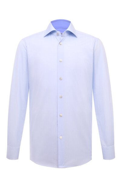 Голубая однотонная сорочка с длинными рукавами выполнена из тонкого премиального хлопка. Гладкая ткань хорошо пропускает воздух и почти не мнется, а исключительный уровень конструирования и соединения деталей гарантирует безупречную посадку модели по фигуре.