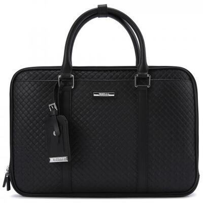 Сумка для ноутбука из чёрной кожи от Baldinini. Сумка выполнена из натуральной кожи с плетёной фактурой. Плотные ручки выполнены из кожи, в комплекте так же съёмный ремень на плечо. У сумки передний карман на кнопке, а так же три отделения с застежками-молниями. Внутри отделение для ноутбука или планшета и удобные карманы. К аксессуару прилагается багажная бирка из кожи.