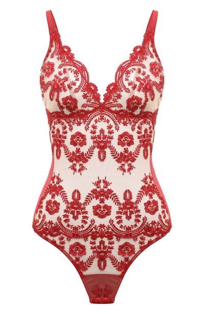 Для изготовления боди с мягкими треугольными чашечками, подчеркнутыми широкими фестонами, использовали почти невесомый прозрачный тюль. На этом воздушном эластичном материале вышили ажурный мотив нитями насыщенного бордового цвета. Модель с регулируемыми бретелями застегивается короткой молнией сзади.