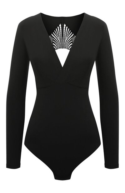 Черному облегающему боди с глубоким V-образным декольте и длинными рукавами добавляет чувственность отделка из графичного изысканного кружева, подчеркивающая открывающий спину вырез. Для пошива модели использовали шелковистый эластичный текстиль, который приятно ощущается на коже и не теряет форму со временем.