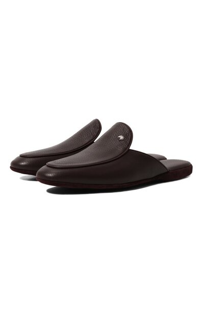 Для изготовления бордовых домашних туфель использовали мягкую эластичную кожу с зернистой фактурой, которую подчеркнули ручной полировкой. Обувь из такого материала комфортно облегает стопу, не сдавливая и не натирая, а нескользящая подошва обеспечивает устойчивость на гладком и мокром полу. Союзку декорировали миниатюрной металлической эмблемой с драгоценным покрытием.