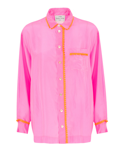 Блуза forte_forte сшита из шелка розового оттенка с отделкой тесьмой. Изделие прямого силуэта в пижамном стиле с застежкой на пуговицы и отложным воротником.
