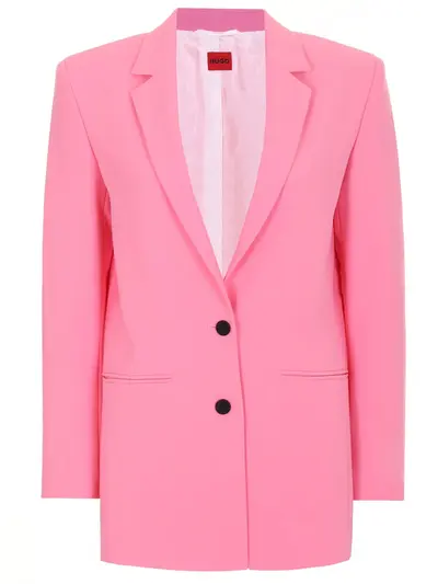 -Розовый пиджак из костюмной ткани купажированного состава от HUGO. -Однобортная модель классического кроя с длинными рукавами, прорезными карманами, лацканами и отложным воротником, застежкой на пуговицы.