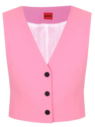 -Розовый жилет из костюмной ткани купажированного состава от HUGO. -Модель классического кроя с V-образным вырезом на груди, застежкой на три пуговицы, логотипом бренда сзади.
