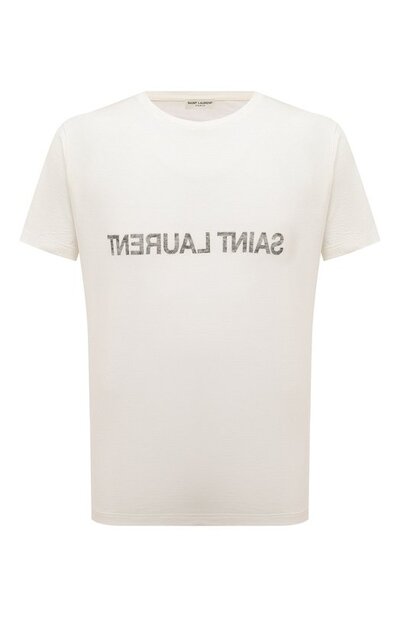 Белая футболка стала идеальным фоном для логотипа марки, который отобразили зеркально. Для пошива изделия мастера бренда, основанного Ивом Сен-Лораном, использовали мягкое хлопковое джерси. Благодаря такому дышащему материалу и прямому крою, не сковывающему движения, в модели будет комфортно в течение всего дня.