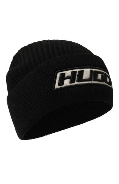 Черную шапку бини выполнили фактурной вязкой из мягкой пряжи на основе прочного акрила и легкой шерсти. Такое эластичное изделие комфортно облегает голову и хорошо защищает от ветра. Широкий отворот украсили белой накладкой с логотипом бренда, вышитым шелковистыми нитями в тон модели.