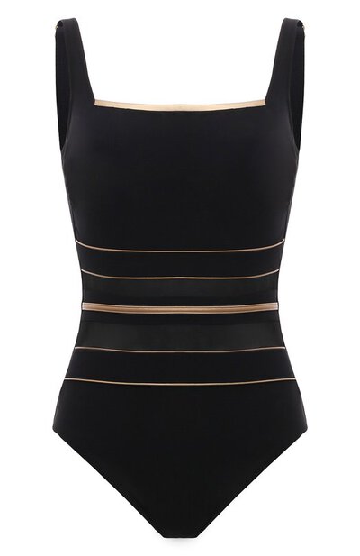Черный купальник с открытой спиной украсили золотистыми горизонтальными полосами, акцентирующими внимание на линии талии. Облегающую модель выполнили из тонкой эластичной микрофибры, не вызывающей раздражения на нежной коже. Широкие бретели позволяют отрегулировать удобную посадку изделия.
